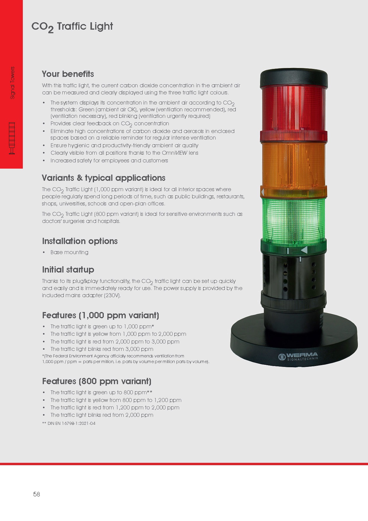 - El semáforo de CO2 (variante de 1.000 ppm) es ideal para espacios en los que hay personas durante periodos largos y periódicos, como edificios públicos, restaurantes, tiendas, universidades, escuelas o incluso oficinas sin paredes interiores.